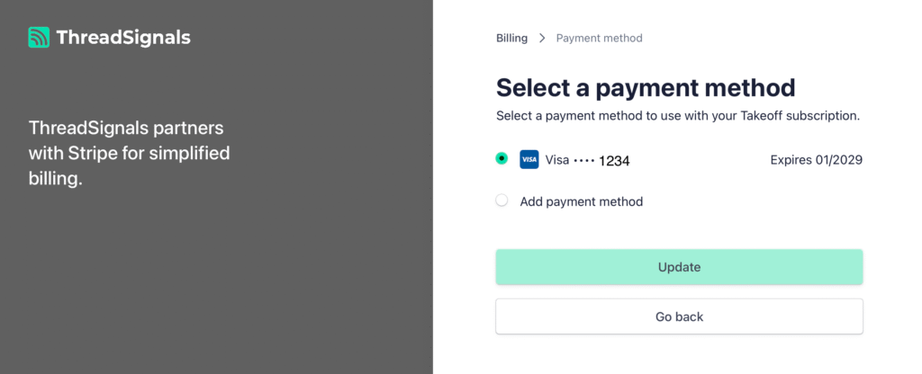 Add a new payment method or update your existing one under Payment Methods.