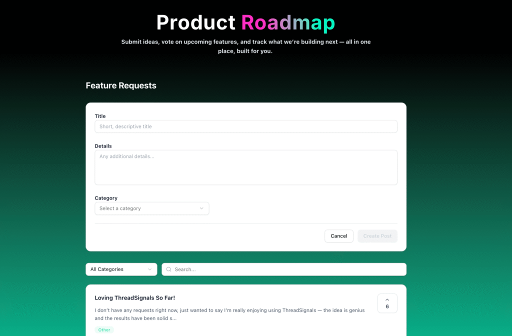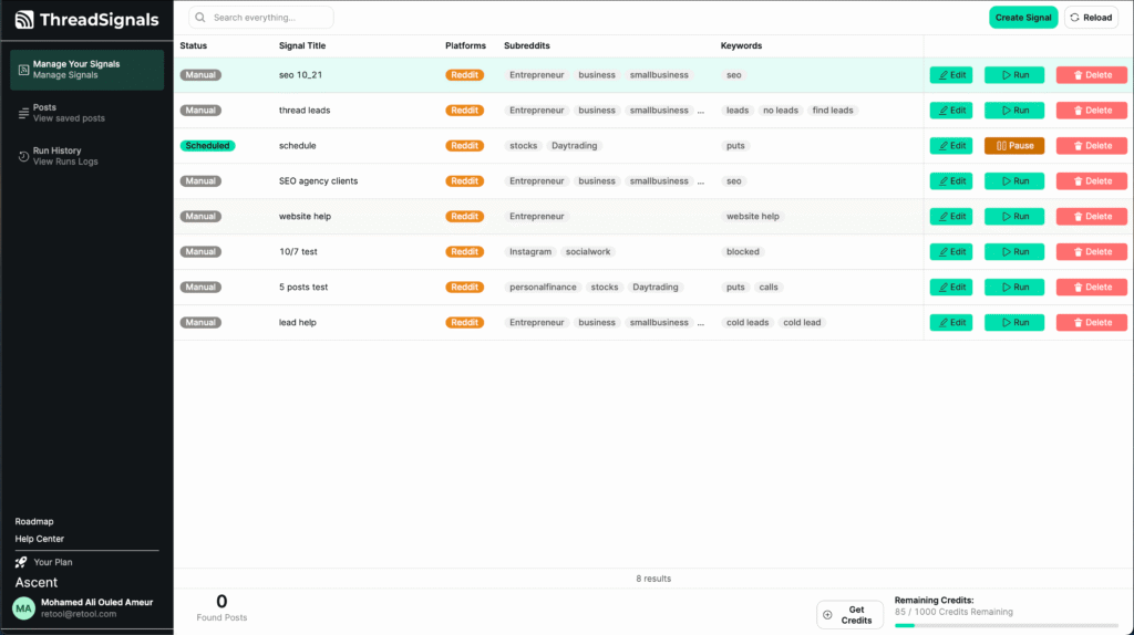 Once you’ve signed in to ThreadSignals, you’ll land on your main dashboard — the central hub for creating Signals, viewing collected posts, checking your run history, and managing your account.