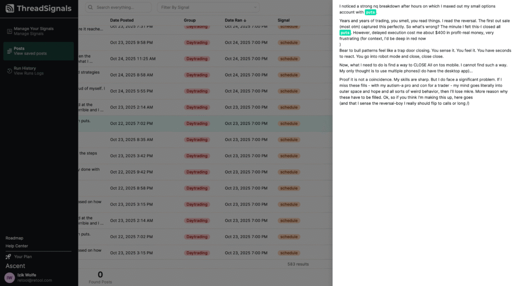 Once ThreadSignals collects posts that match your keywords, you can easily review, export, and respond to them directly from the Posts section.