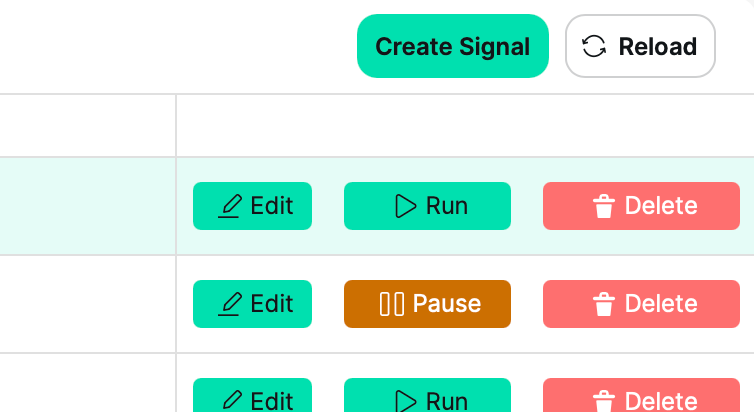 For scheduled Signals, the Delete button is to the right of the Pause or Resume button.