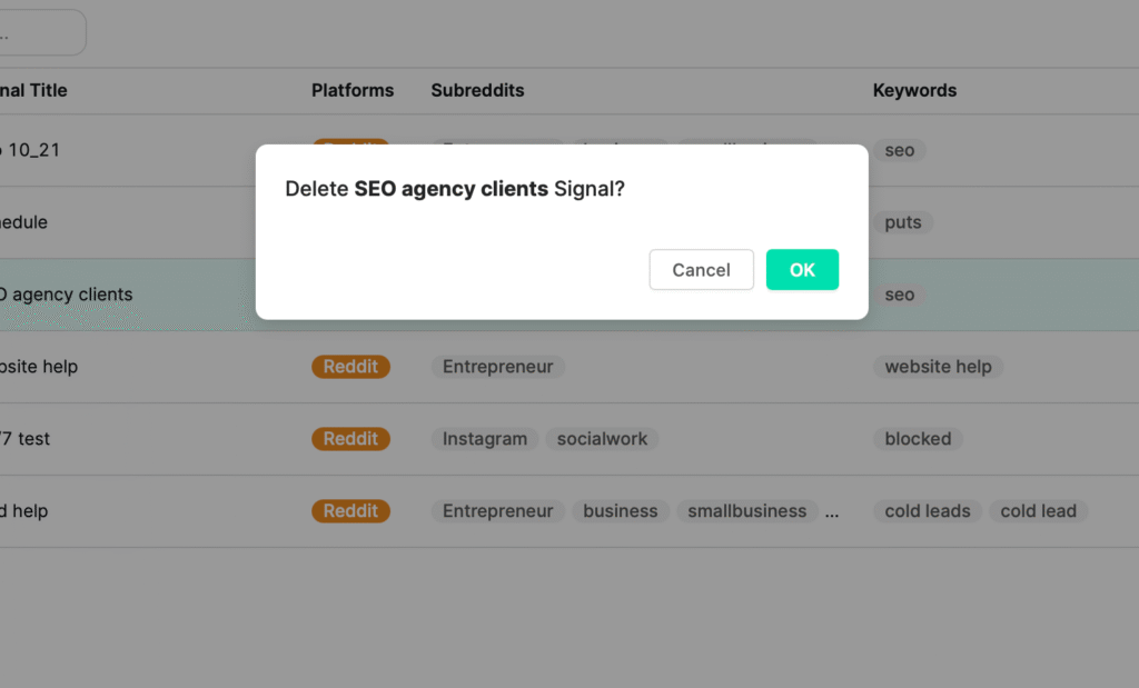 Before deleting, consider pausing a Signal instead—especially if it’s performing well. You can always reuse the same keywords or subreddits later without starting from scratch.